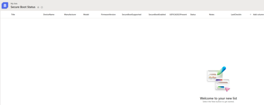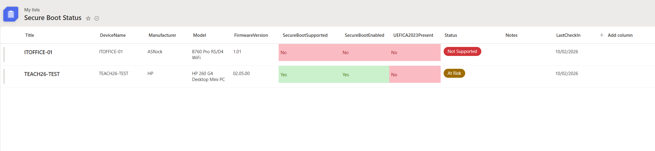 Not to worry, i’ve created a tutorial below on how you can poll devices via intune, and import their status into a SharePoint List. This gives you instant data on if a device has SecureBoot Enabled, and if the 2023 Certficate is present.